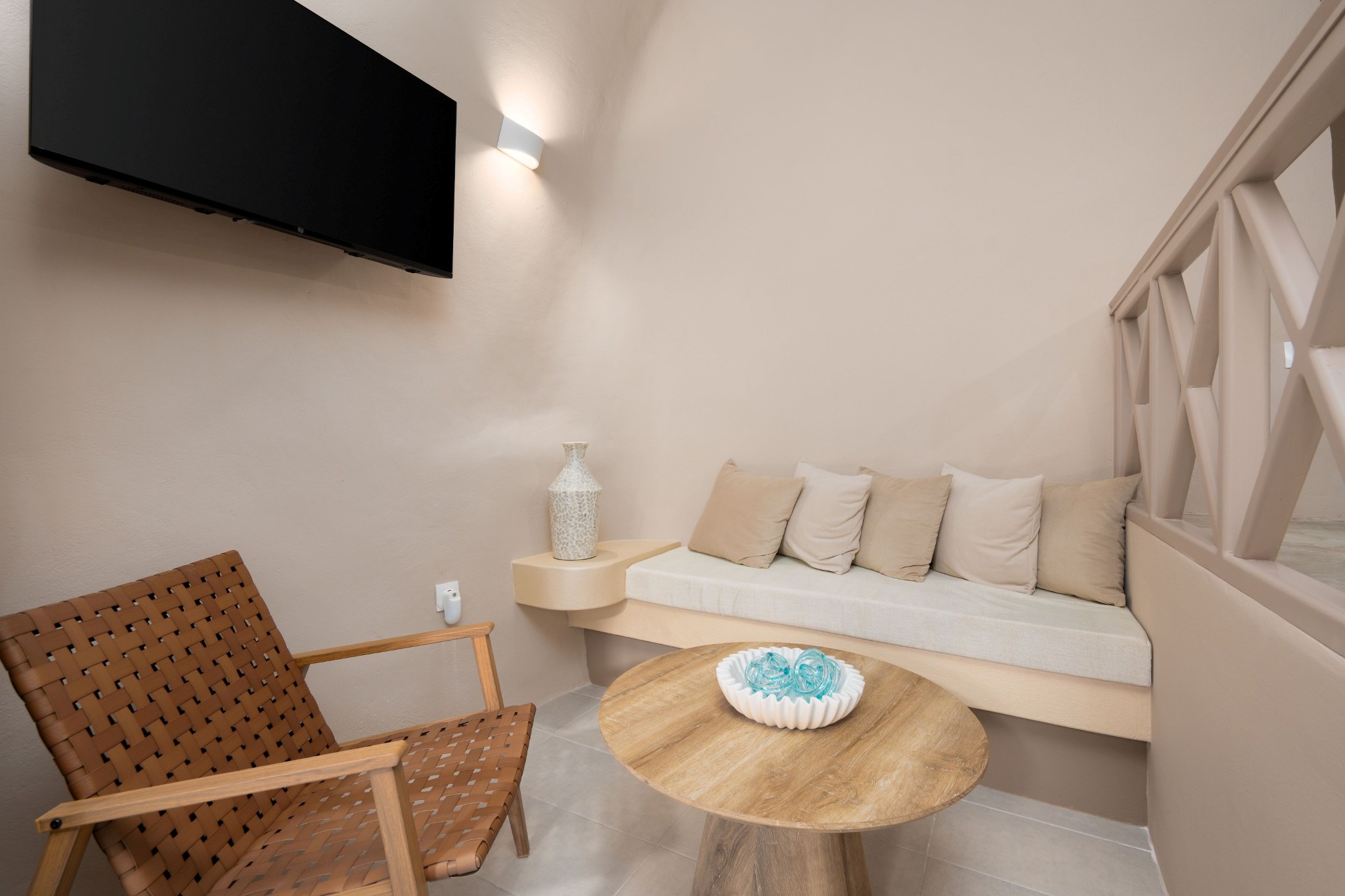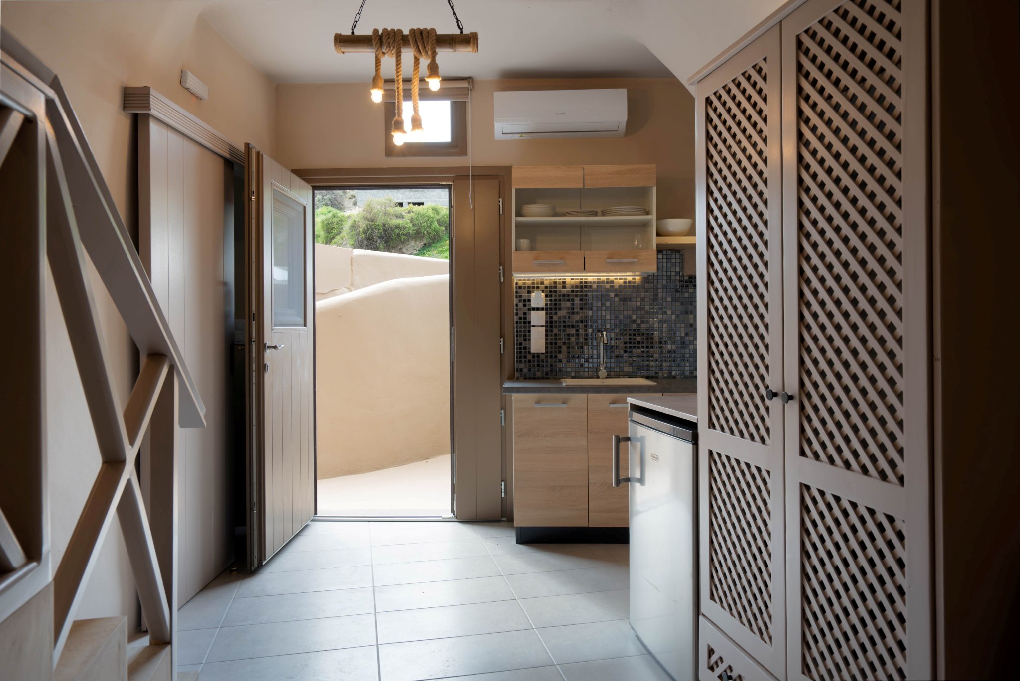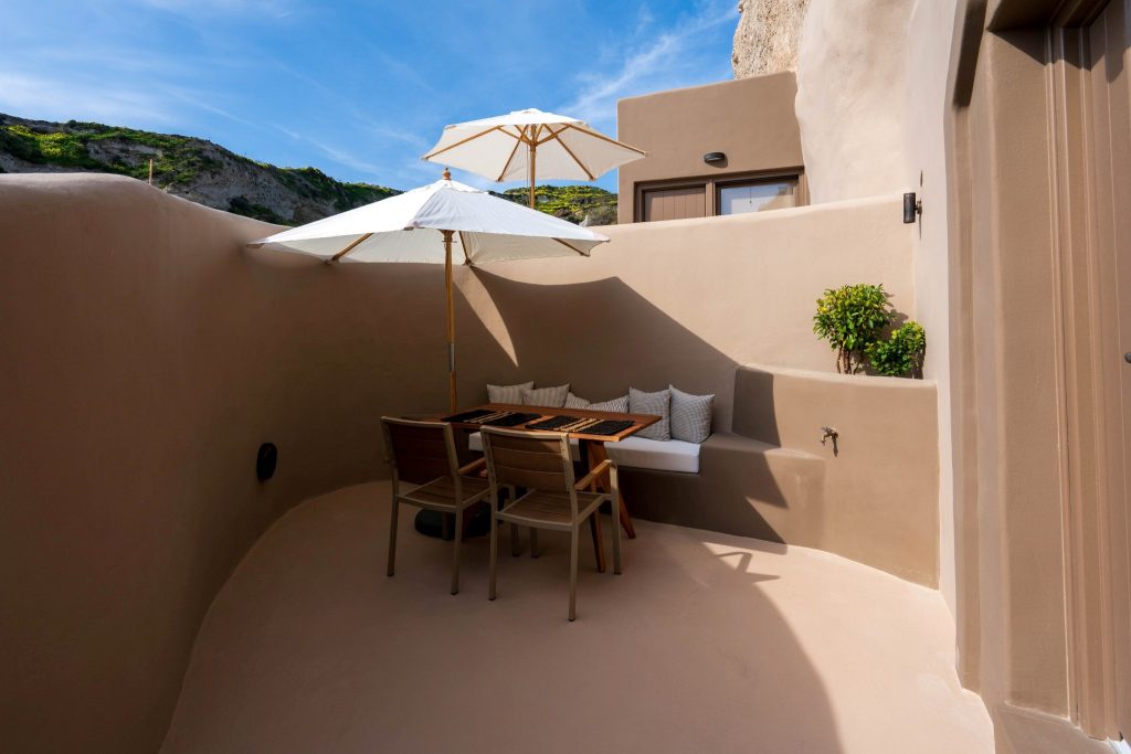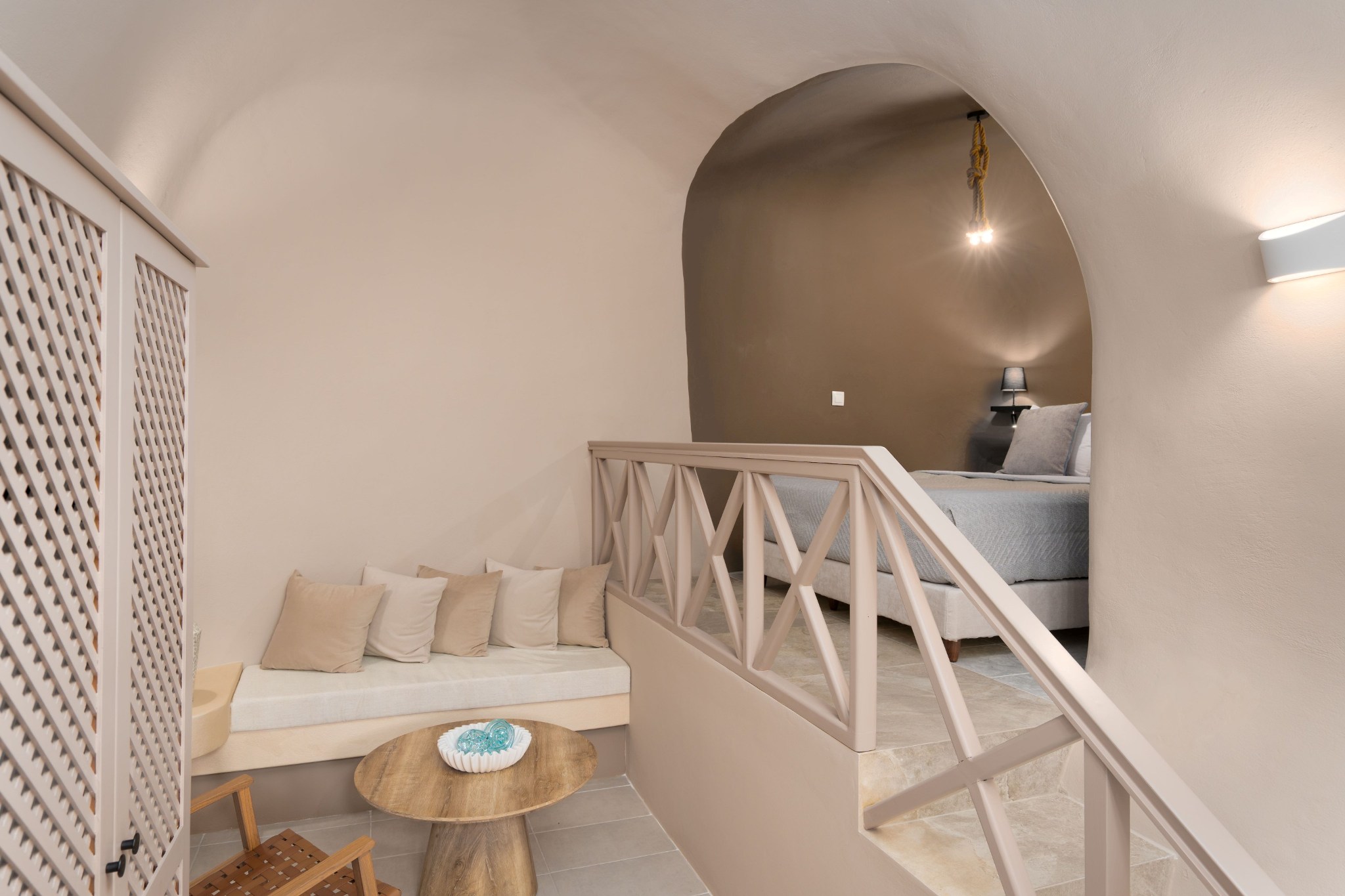 At the entry level, a quiet space of seating and kitchenette unfolds with ease, while three steps above, a vaulted-ceiling bedroom rises gently into its own rhythm. A subtle change in height creates a sense of separation without ever dividing the flow. Outside, the horizon opens wide, and morning light drifts softly across natural stone.