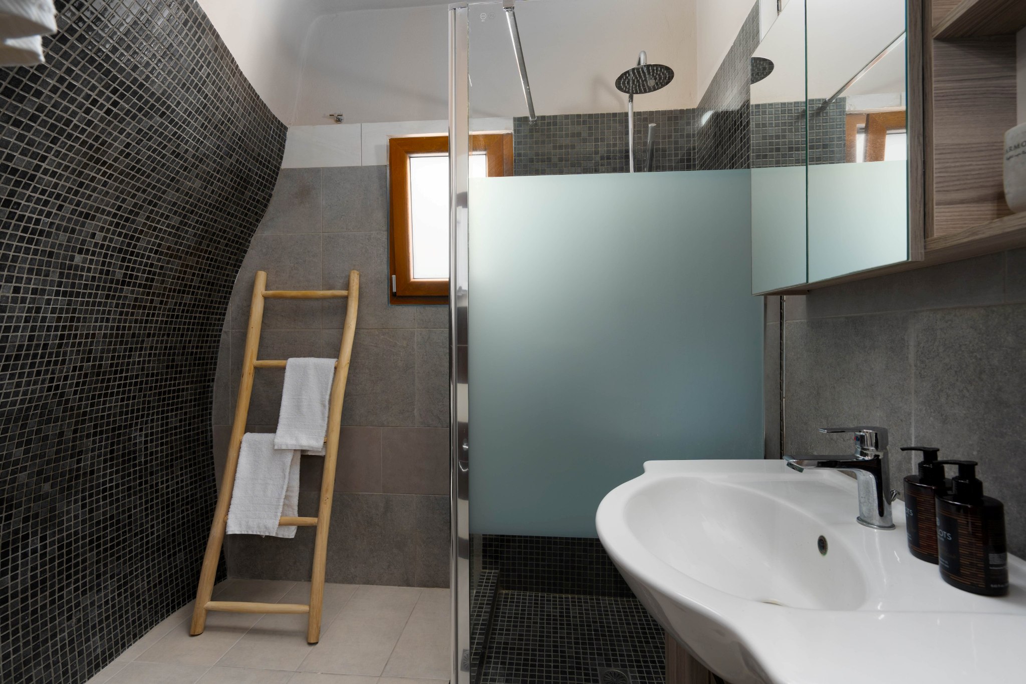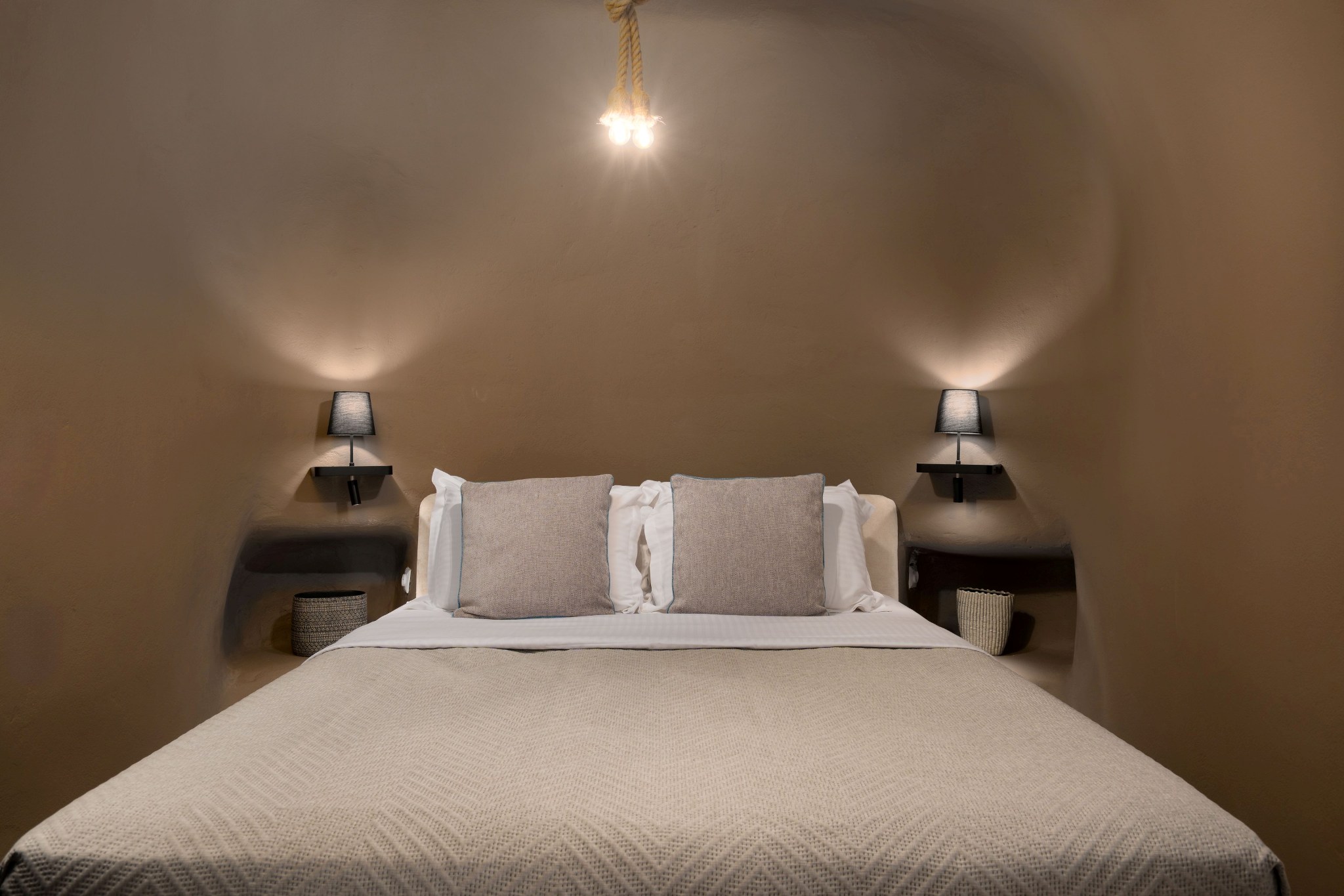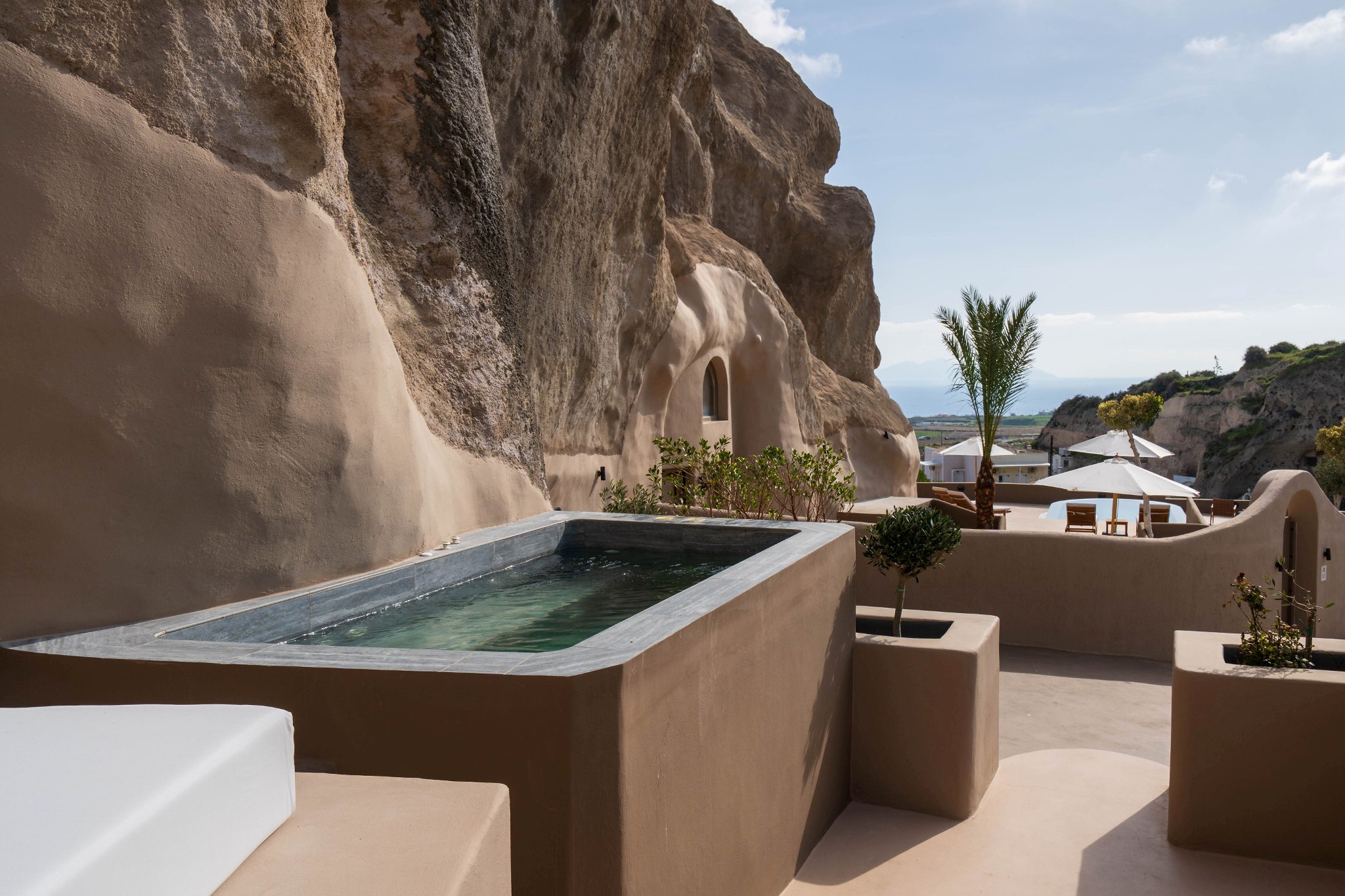 At the entry level, a quiet space of seating and kitchenette unfolds with ease, while three steps above, a vaulted-ceiling bedroom rises gently into its own rhythm. A subtle change in height creates a sense of separation without ever dividing the flow. Outside, the horizon opens wide, and morning light drifts softly across natural stone.